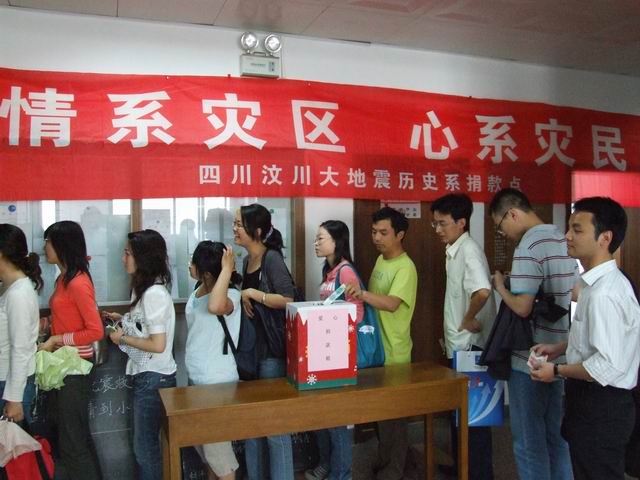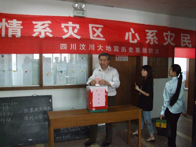 四川省汶川市特大地震引起全国人民的关切,也牵动了南大人的心。5月13日,历史系党政和工会在第一时间召开会议并转发公司党委委托工会关于抗震救灾的紧急通知,动员全系师生为四川灾区人民踊跃捐款。系党政领导班子带头为灾区捐款,广大师生积极投入为抗震救灾进行的捐款活动。世界史和国际关系等专业的研究生还自发地投入捐款的组织活动。截至昨天中午,历史系师生已经捐款28765元人民币。