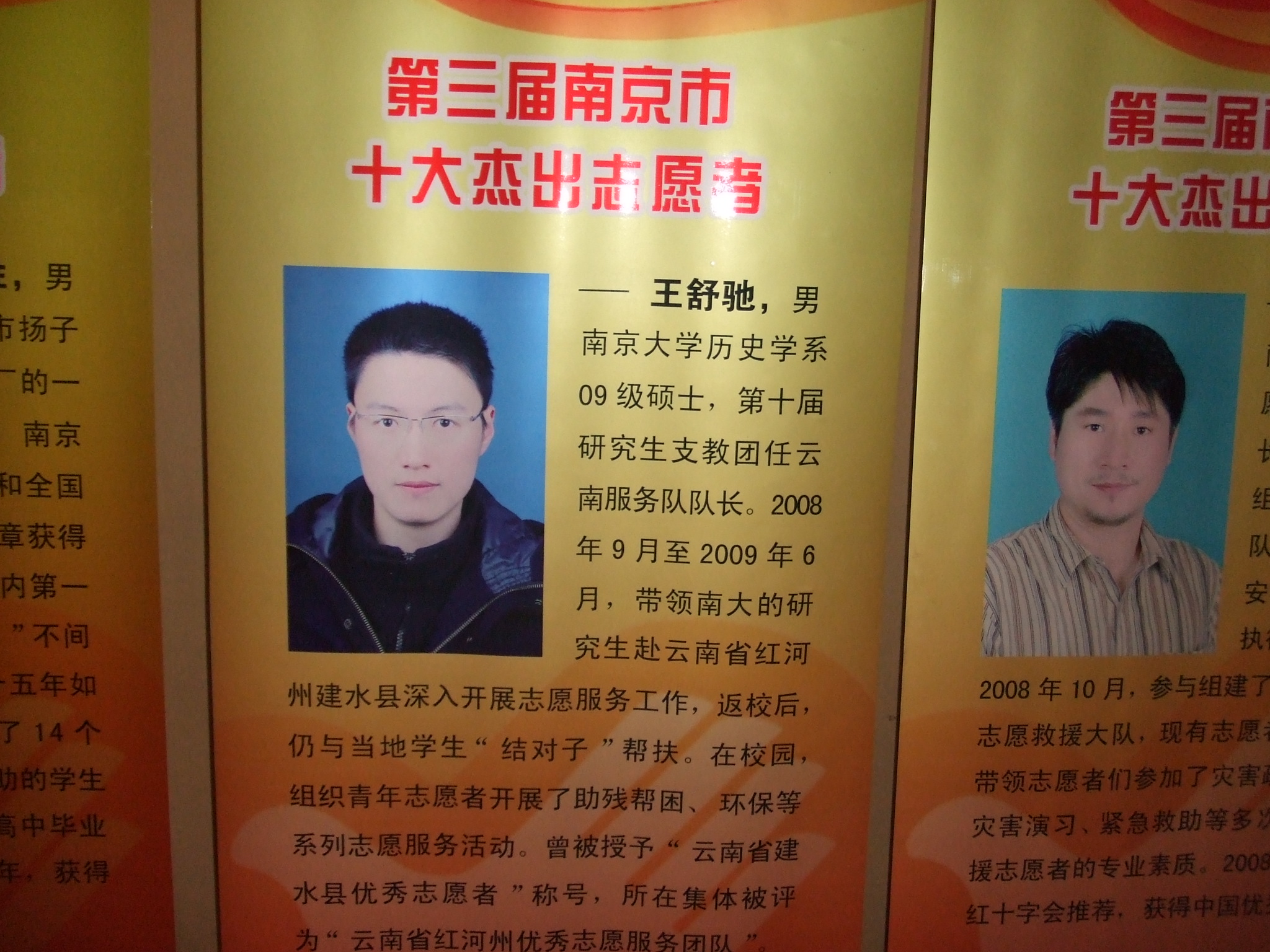 3月5日是“学雷锋纪念日”,也是“南京市志愿者日”。共青团南京市委联合多家单位和媒体在山西路青春剧场举办了“志愿服务青奥行动”启动暨第三届“南京市十大杰出志愿(志愿服务集体)”颁奖仪式。会上,市委常委许慧玲、团省委副书记张国梁等领导出席会议并为获奖者颁奖。我系王舒驰同学获“南京市十大杰出志愿者”称号,并在颁奖仪式后进行了个人事迹宣讲。 王舒驰同学系我系中国近现代史09级硕士,suncitygroup太阳集团官方网站第十届研究生支教团云南服务队队长,于2008年9月至2009年7月赴云南省红河州建水县开展志愿服务工作。他的获奖,是我系长期重视员工思想道德工作的成果,也是我系广大同学心怀爱心、乐于助人,积极服务于社会主义和谐社会的重要体现。