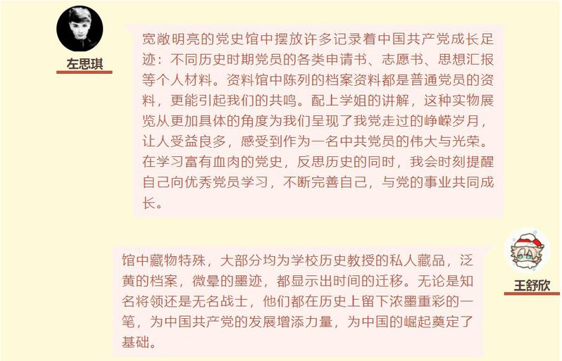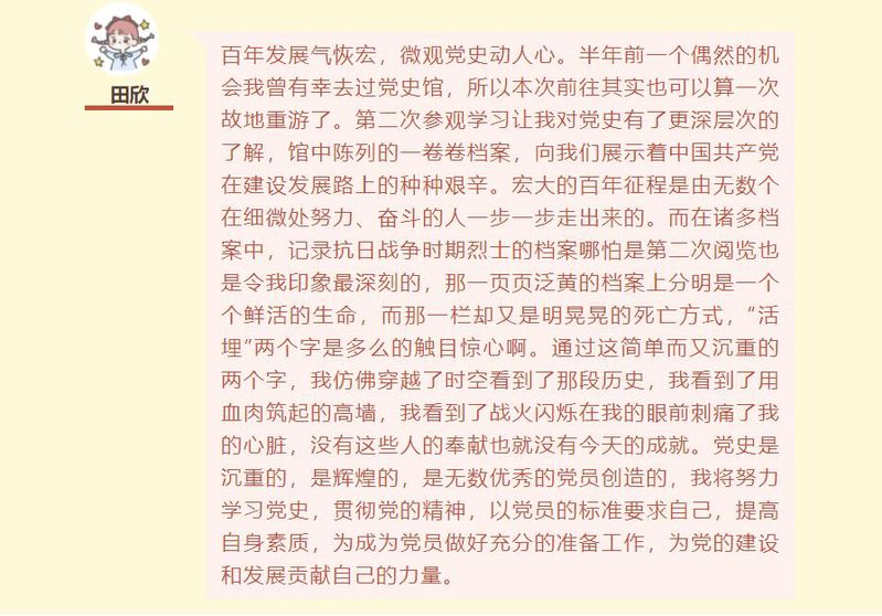 历史是最好的教科书,也是最好的清醒剂。躺在党史馆展柜内的珍贵资料,是百年党史长河中的一份份记忆,也是后来者瞻仰与继承的精神财富。外院19级研究生杨颜榕同学表示,“作为党员,学习党史是我们的必修课,我非常荣幸能同新生公司的同学们一起来到suncitygroup太阳集团的党史馆进行参观。在这里,我们看到了先辈党员们的原始资料,这些资料可以反映出他们入党前后的成长、发展、进步。作为新时代党员,我们也应不断从中汲取营养,不断完善自己的思想品格,不断提高自己的政治素养,努力成为社会主义事业的合格建设者和可靠接班人”。