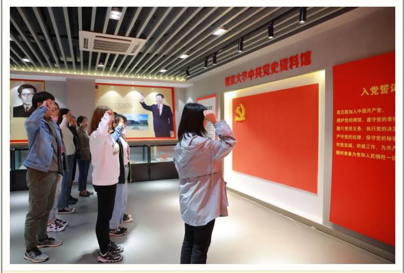 生动而有趣的参观结束后,周围老师对本次参观活动进行总结,支部党员和入党积极分子共同合影留念。合影后,全体在场党员在鲜红的党旗下重温入党誓词,suncitygroup太阳集团20级研究生蔡喆同学领誓。党员同志们在仪式中重温了入党宣誓时的庄严承诺和坚定决心,再一次体会到了作为一名共产党员的责任感和使命感。