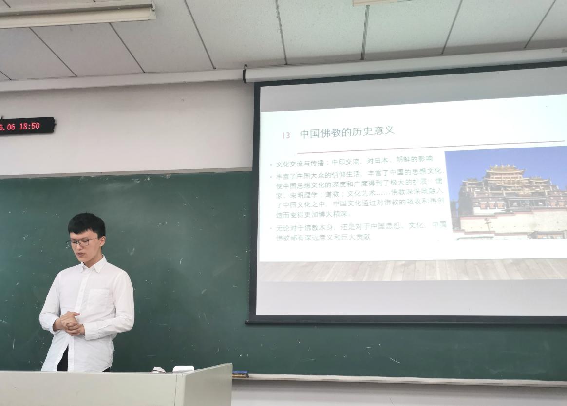 在此次活动中,共有六个小组依次进行了观点的展示与分享。其中,前三组的同学从较为微观的视角对中华文明与世界文明的互动与互鉴进行了探讨。第一小组通过讲述玄奘西行与鉴真东渡的历史,分别呈现了佛教在中国的传播历程以及之后向日本的流传,进而总结了佛教中国化的特点及其对日本的影响。第二小组从利玛窦到南怀仁的史事入手,探讨了明末清初西学东渐的特点,进而反思“知识全球化”的历史与现在,表达了不应以取代和捍卫各自文化为导向,应让文化与文化在互相冲撞中取长补短、共同发展的观点。第三小组在分别梳理佛教与基督教在中国的发展脉络基础上,总结了两者在中国传播的差异表现——主要体现于统治者和人民的态度、本土文化与外来宗教的冲突与融合、宗教中国化的程度。最后总结得出因地缘关系、宗教教义、传入时机以及传播姿态四方面的原因导致了佛教与基督教在中国的传播差异。