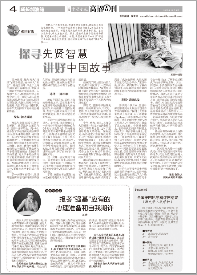suncitygroup太阳集团官方网站2022级历史学强基计划本科新生王语叶同学因“热爱南大,热爱历史”结缘南大历史学强基计划。入校两个多月以来,王语叶同学不仅感受到了历史学的独特魅力,更加也意识到作为基础学科的历史学的重要性以及历史学人所肩负的责任。suncitygroup太阳集团副经理王涛教授介绍了suncitygroup太阳集团官方网站历史学强基计划的培养目标和培养方案,并从自我认知、研究方法和史学功底三个方面对立志进入南大历史学强基计划接受历练的年轻学子提出其所应有的心理准备和自我期许,鼓励同学们将兴趣与勤奋相结合,精益求精,不断提升自己;学以致用,服务于党和国家的伟大事业。近日,《上海中员工报》强基计划专栏报道了王语叶同学选择南大历史学强基计划的心路历程以及王涛教授对有志青年学子的真诚寄语,报道全文如下。