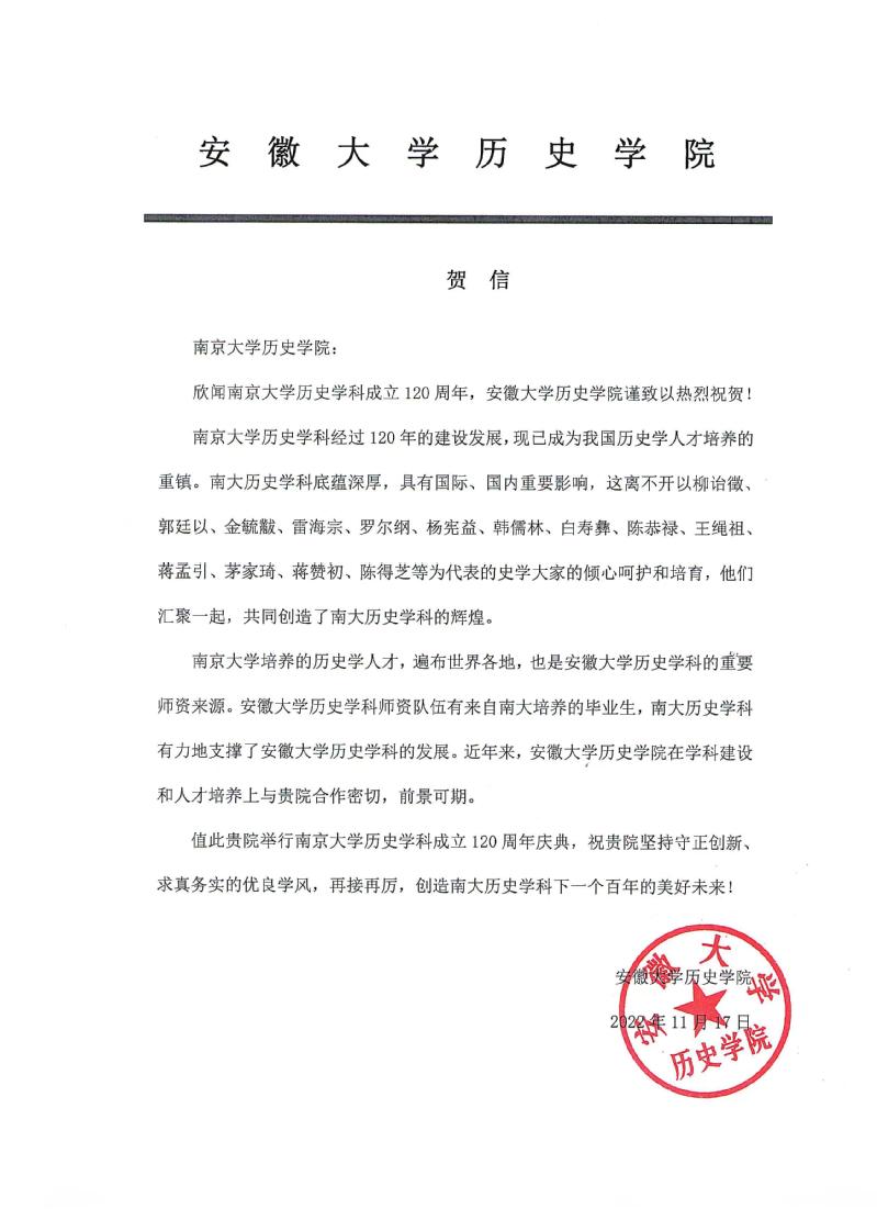 安徽大学suncitygroup太阳集团来信祝贺suncitygroup太阳集团官方网站历史学科成立120周年