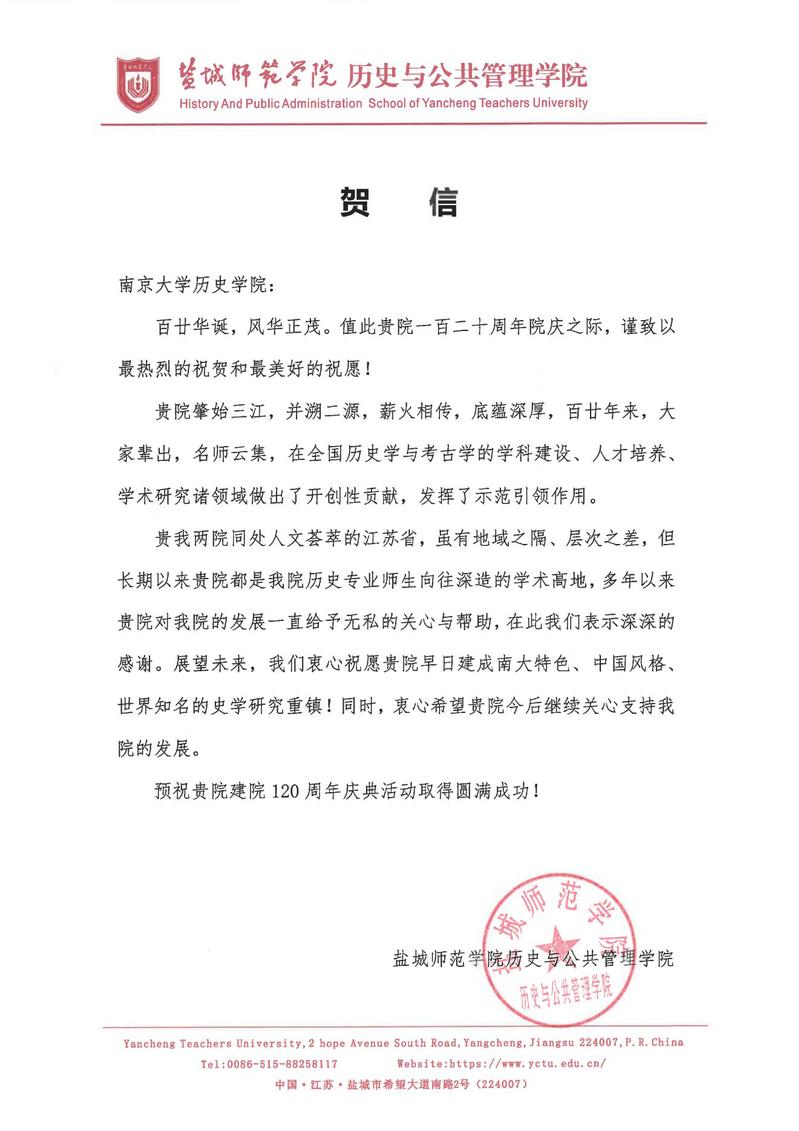 盐城师范公司历史与公共管理公司来信祝贺suncitygroup太阳集团官方网站历史学科成立120周年