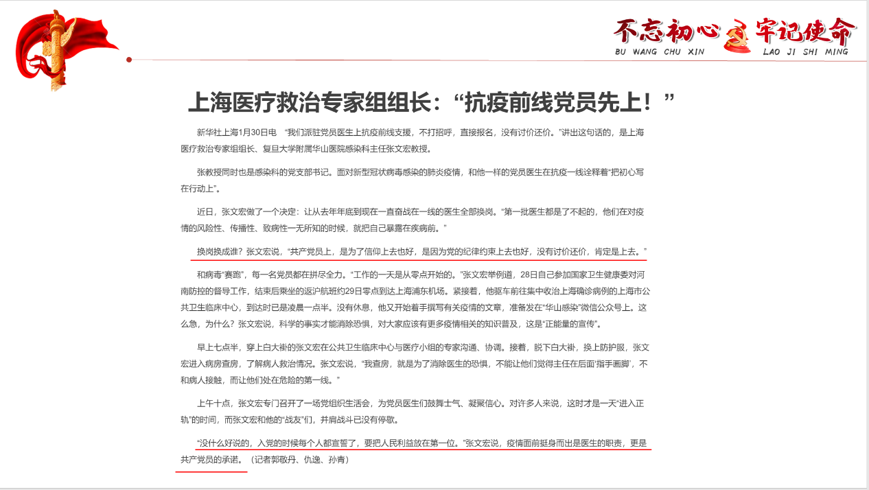 杜帅澎:我所分享的感悟是来自于我所在的社区的党员同志们。自疫情爆发开始,响应党组织号召,我们社区的党员同志们主动设置党员先锋岗,宣传防疫知识,对出入人员进行体温检测,此次疫情恰逢春节期间,小区居民众多而党员数量相当有限,工作任务重,换岗少,但是每一位基层党员同志都有坚定信心和高尚的觉悟,不辞辛苦坚守基层防线,真正地发挥了党员的先进作用,牢记使命,时刻不忘为人民服务的宗旨,切实地守护群众的健康,就像雷锋同志所言的“钉子精神”一般扎根在基层,我个人在帮助他们的工作之余也很受触动。疫情中全国奋战的每一位基层党员同志们都是我们的榜样。