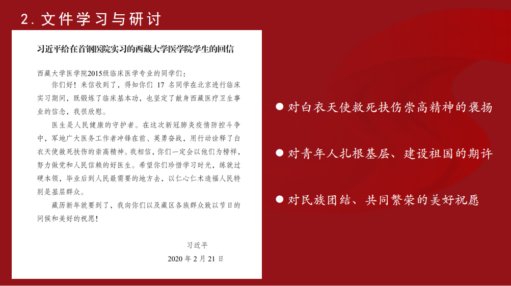 第二部分,团支书段浩然向全班同学传达了习总书记给西藏大学医员工回信的主旨与精神。总书记主要表达了三个希望,分别是对白衣天使救死扶伤崇高精神的褒扬;对青年人扎根基层、建设祖国的期许;对民族团结、共同繁荣的美好祝愿。在学习过程中,全班同学还通过suncitygroup太阳集团的具体实践案例,深刻感受到普罗大众在特殊时期的光辉身影。