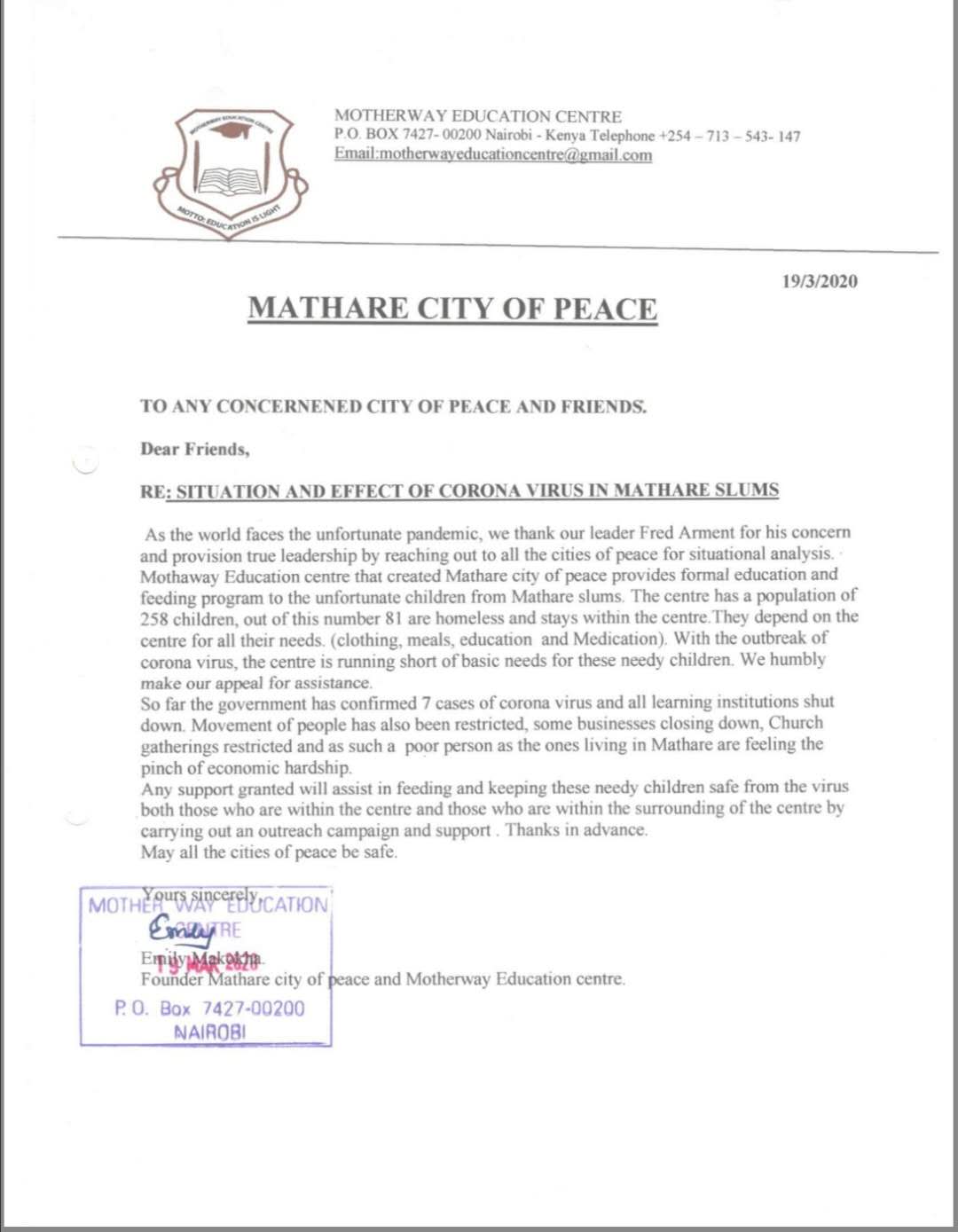 3月22日,非洲13个和平城市的领导人通过Fred会长向教席发来求助信。尼日利亚万巴市在来信中直言:“尼日利亚的新冠病例已经有8例疑似病例,按照目前的情况,如果不采取预防措施,病例可能会增加。这种病毒正在使我们的爱人、家人、朋友分离,它也影响着我们的教育系统。我们需要医疗和物资的帮助,以维持我们的社区的安全”。