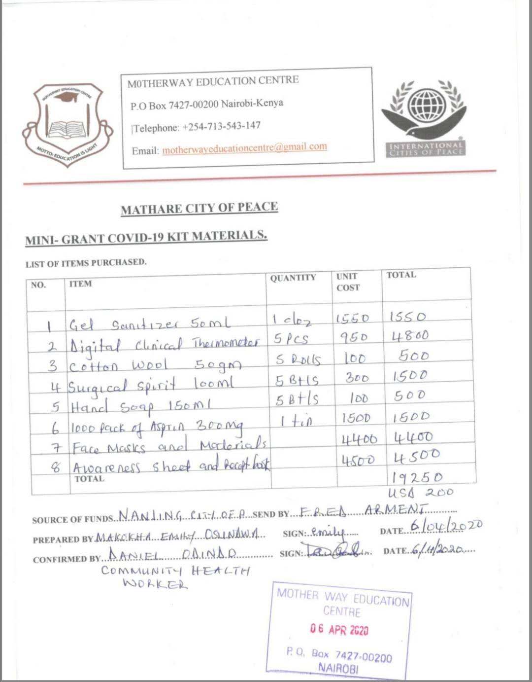 再例如,肯尼亚马萨雷市使用赠款的最新情况:“马萨雷是一个人口稠密的地区,平均一家6口人住在7 x 10英尺的单间棚屋里。中国和平城市南京提供的赠款购买预防工具包的材料包括:1.洗手液,2.体温计,3.清洁温度计用异丙醇,4.药棉,5.洗手皂,6.面罩材料”。