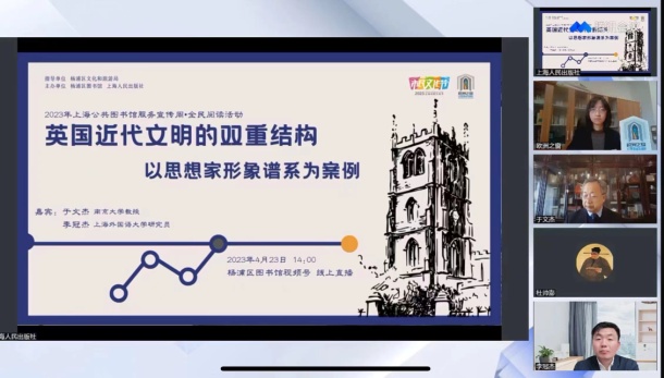 在2023年4月23日世界第26个读书节到来之际,公司于文杰教授应上海市杨浦区图书馆和上海人民出版社的邀请,举办了一场题为“英国近代文明的双重结构”的学术讲座。来自上海及海内外读者570余人聆听了讲座。上海外国语大学英国研究中心李冠杰研究员主持了学术演讲并就相关问题展开对话。