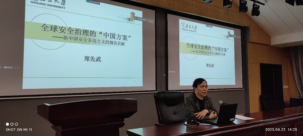 之后,公司党委理论讲师团成员、公司郑先武教授为全体师生党员带来主题为“全球安全治理‘中国方案’”的党课。郑先武老师从时代性、历史性、创造性三个角度着眼,分析了全球权力大转移的周期、目前新的动荡变革期、地缘政治回归和区域问题突显和中美全面竞争日益加剧的时代属性;接着郑老师从历史性角度分析了新中国安全多边主义的演进历程,从传统型和平外交到务实型发展外交再演进到引领型总体外交,介绍了“一带一路”倡议、丝路基金的设立、澜湄国家共同体建设以及促进沙特与伊朗和解等行动引领方面的重大成就;最后,郑老师从人类命运共同体开始,从“新型国际关系”、总体国家安全观、“亚洲安全观”发展到习近平总书记2020年在博鳌亚洲论坛上首次提出“全球安全倡议”,创造性地提出了应对世界之变、时代之变和历史之变的最新“中国方案”,为推进全球安全治理、应对国际安全挑战贡献了“中国智慧”,更为维护世界和平安宁指明了“前进方向”。这次党课,从国际关系领域全面分析了全球安全治理“中国方案”的提出、具体内容和重大意义,在把握历史规律和掌握发展航向的基础上,教育引导全院师生党员厚植爱党爱国情怀,进一步坚定“四个自信”,是运用历史思维,把握内在规律,将理论与实践、历史与现实融会贯通的生动一课。