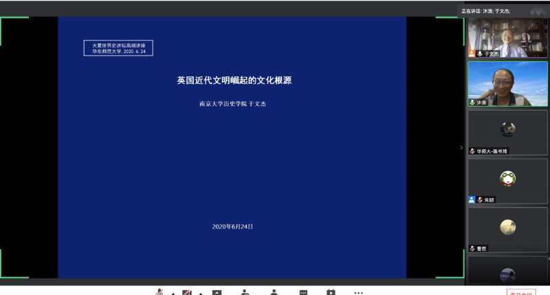 应华东师范大学suncitygroup太阳集团的邀请,我院于文杰教授于2020年6月24日下午在“大夏世界史讲坛高端讲座”上发表演讲,演讲的题目是:《英国近代文明崛起的文化渊源》,来自高校和科研院所的师生300余人聆听了讲座。讲座由世界历史研究院经理沐涛教授主持。