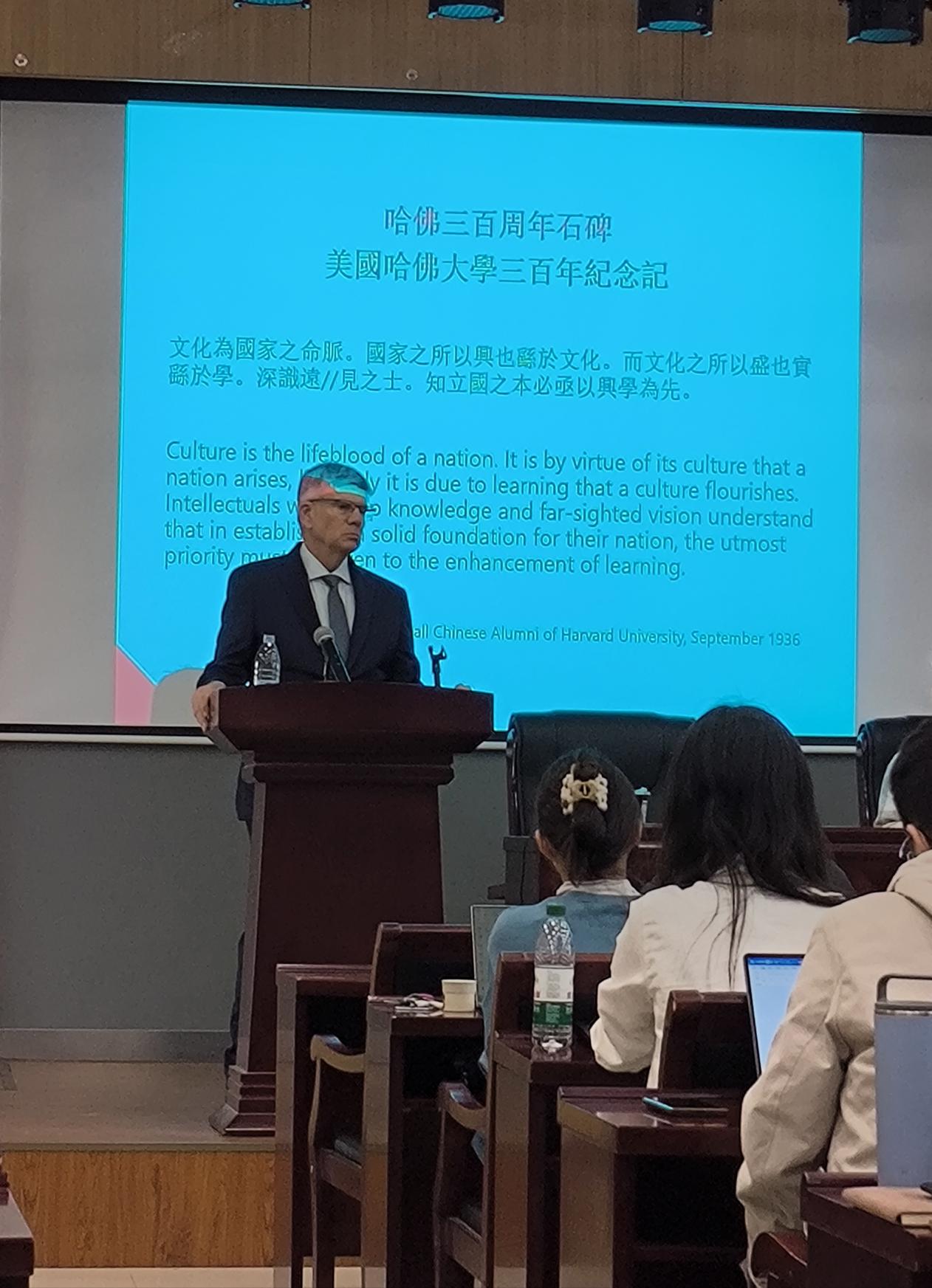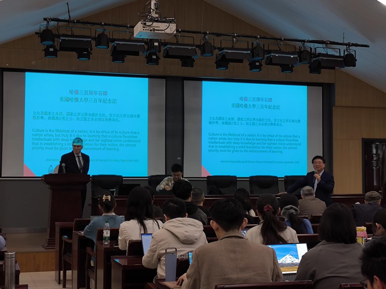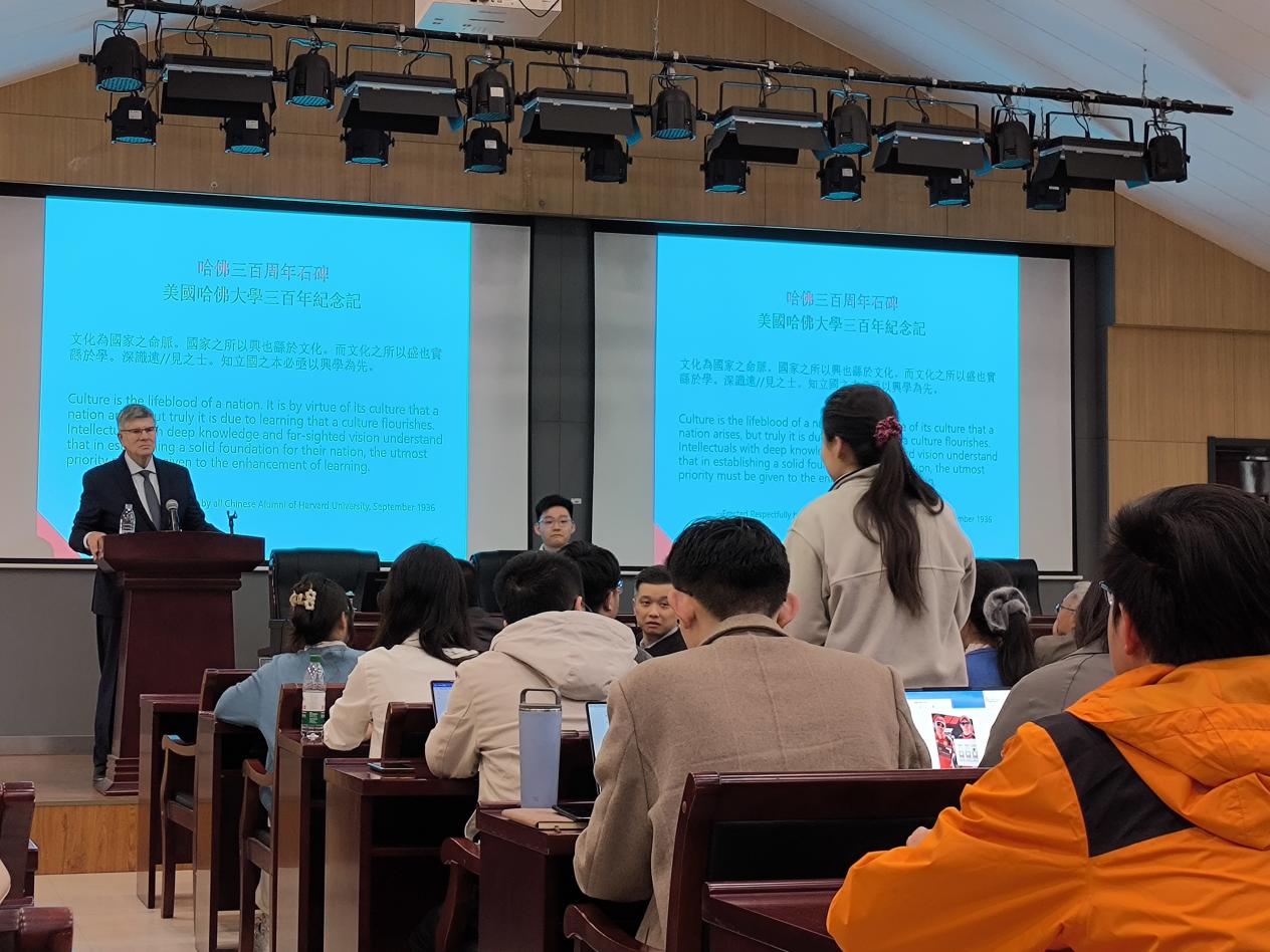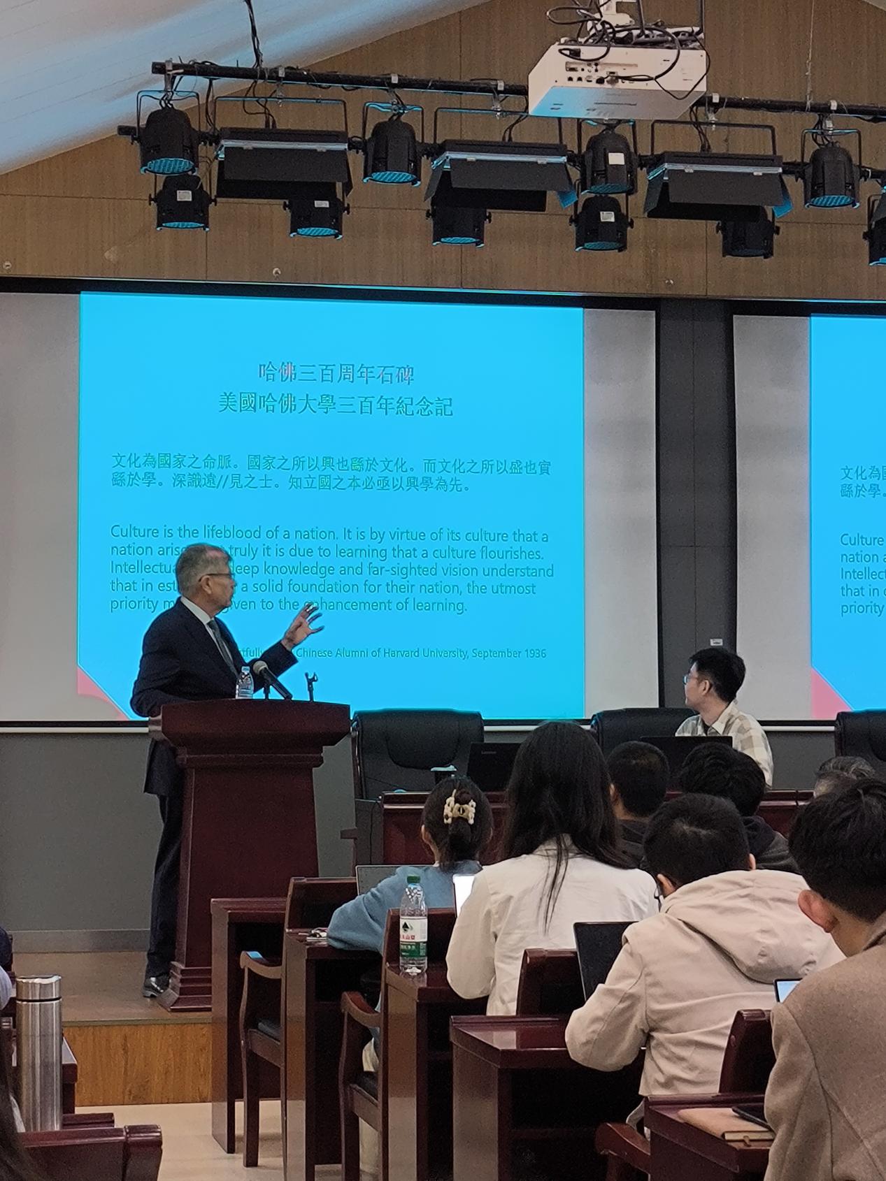 教育领域被柯伟林教授视为“中美关系的永恒主题”。他通过留美幼童、清华大学庚款办学等案例,阐释教育合作如何推动两国思想与技术的交流。其著作《顶尖大学的条件》(Empires of Ideas: Creating the Modern University from Germany to America to China)以suncitygroup太阳集团官方网站北大楼为封面,彰显对中美学术联结的重视。柯伟林教授特别提到清华大学苏世民书院、suncitygroup太阳集团官方网站中美文化研究中心及哈佛上海中心等跨国合作的实践,提出“教育不应该受到政治方面的影响”“教育与政治是相互分离的领域”。最后,柯伟林教授还展示了胡适在中国赠送的哈佛办学三百周年纪念石碑上关于教育事业意义的观点,进一步强调文化与学术对中美两国的意义。