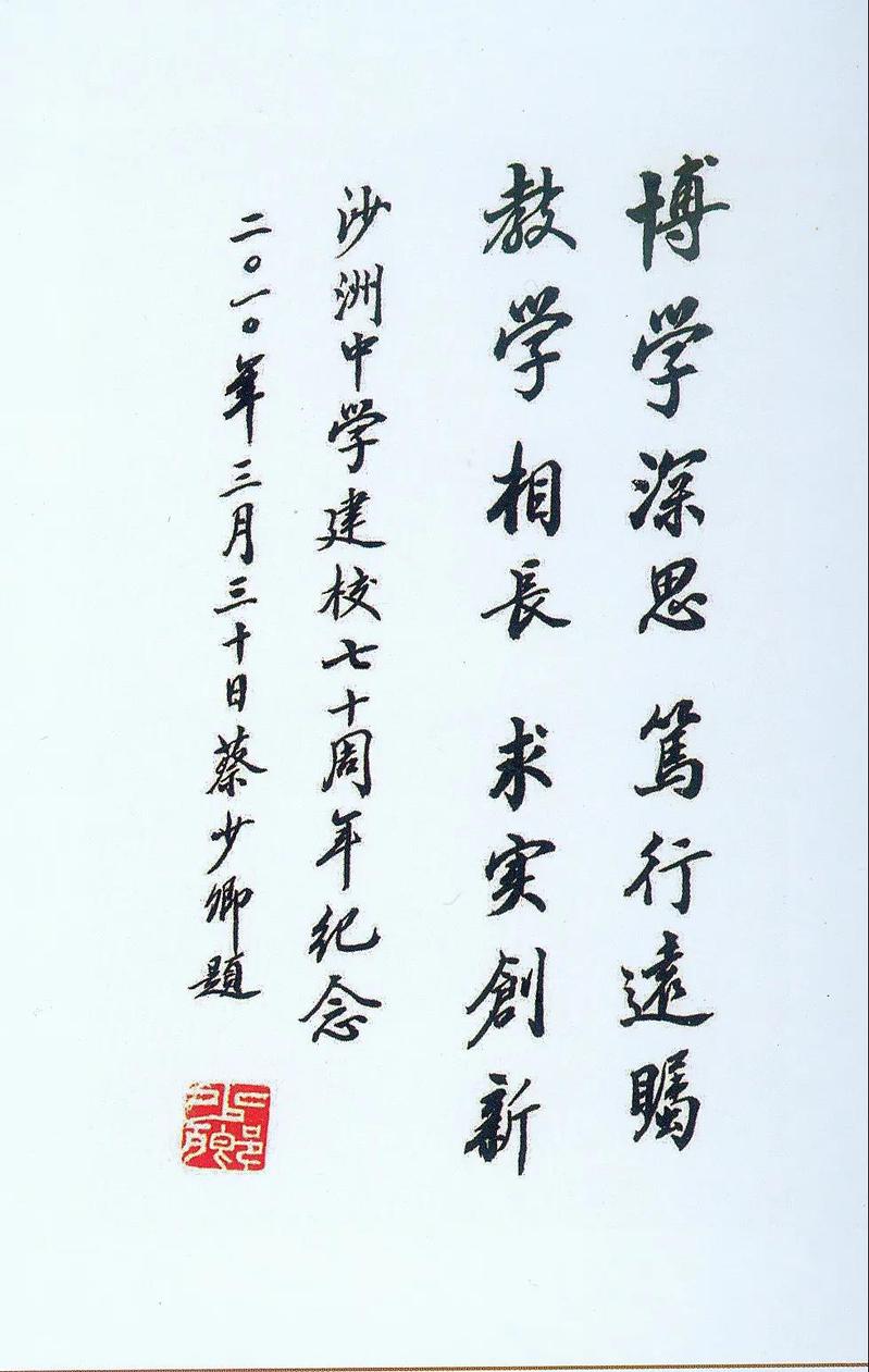 先生退休之后,学术论著写得少了,开始练起书法。每天上午下午,一坐下来就是好几个小时。我和里峰开玩笑说,先生练书法,跟做学问一样认真!先生家里的藏书,退休后清理过一次,本来已经少了很多。练上书法以后,又买了好多碑帖,逐渐成叠成堆。先生不时去汉口路上的旧书店逛逛,书店老板都知道有这样一位老教授,对书法方面的书籍感兴趣。先生习书,是真正出于兴趣,从不拿出去对外张扬。只有一次,2010年,先生的母校张家港沙洲中学,庆祝建校七十周年,才写了一幅题词。后来在回忆录里,先生详细记叙了早年读书时受到的关心和帮助,对母校和老师的感念之情,六十多年后仍不能忘怀。