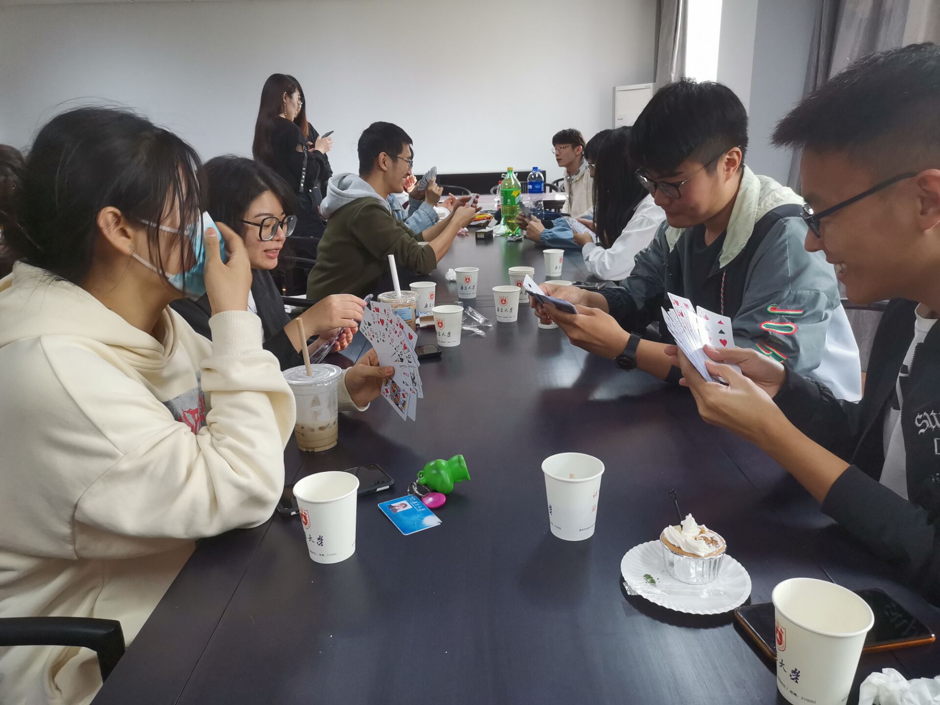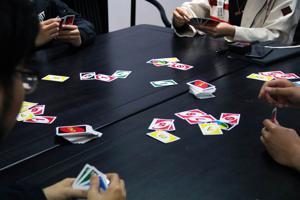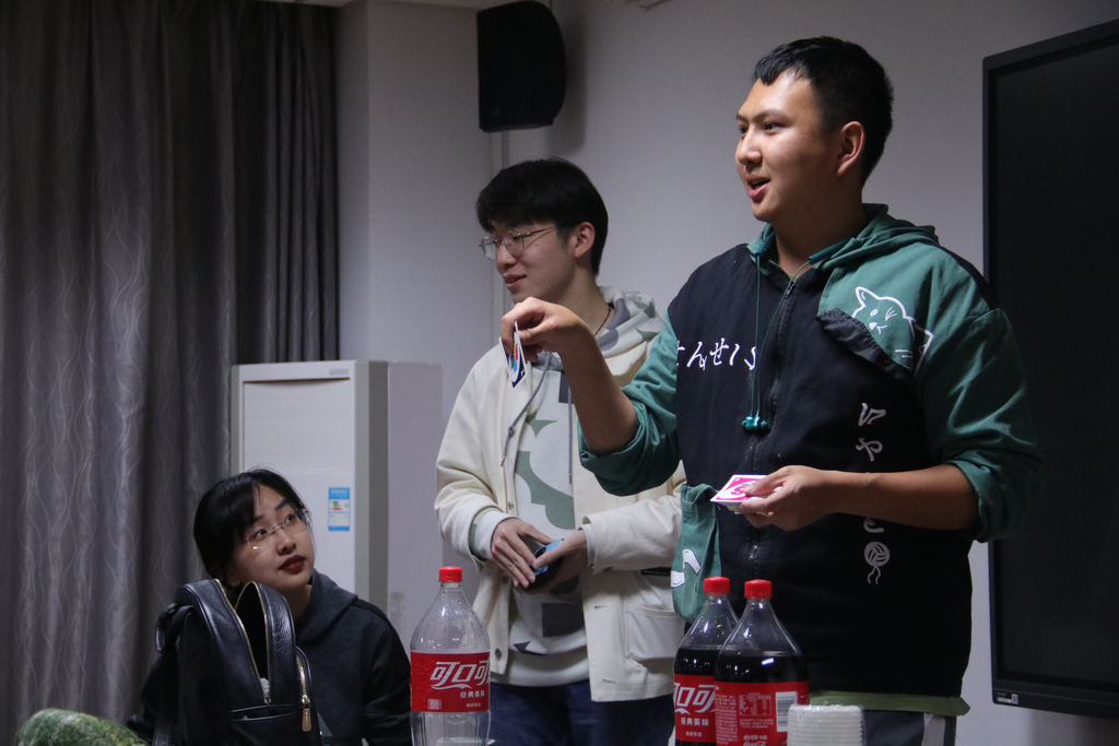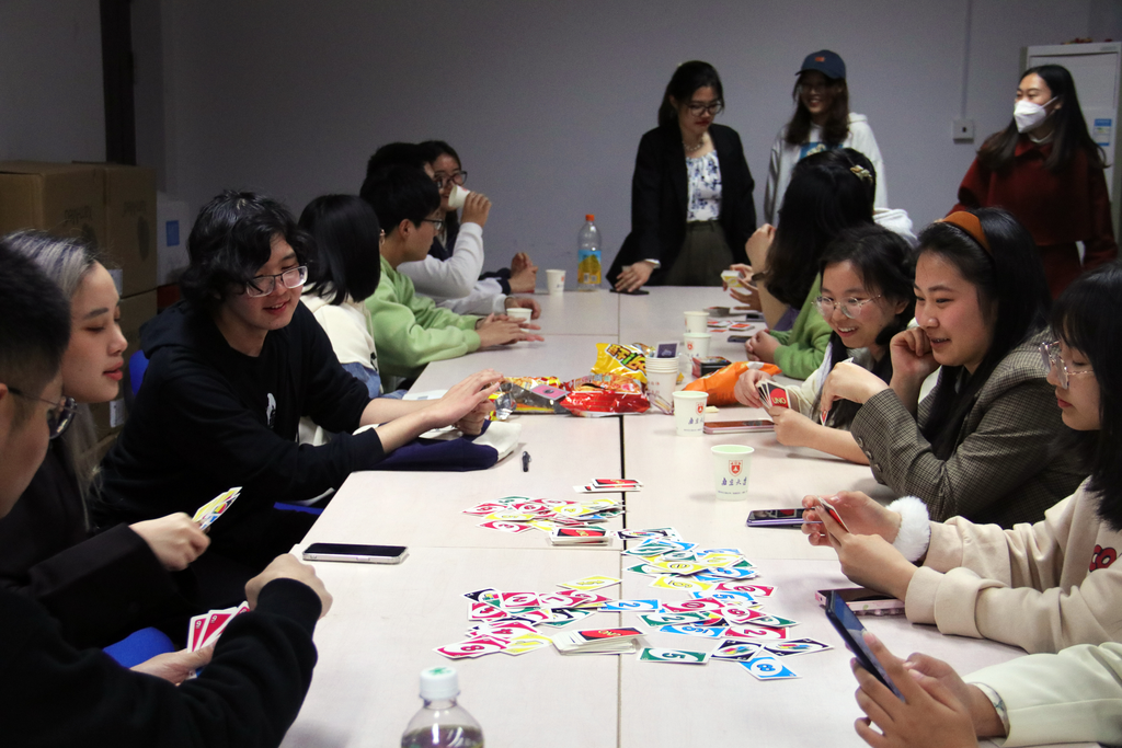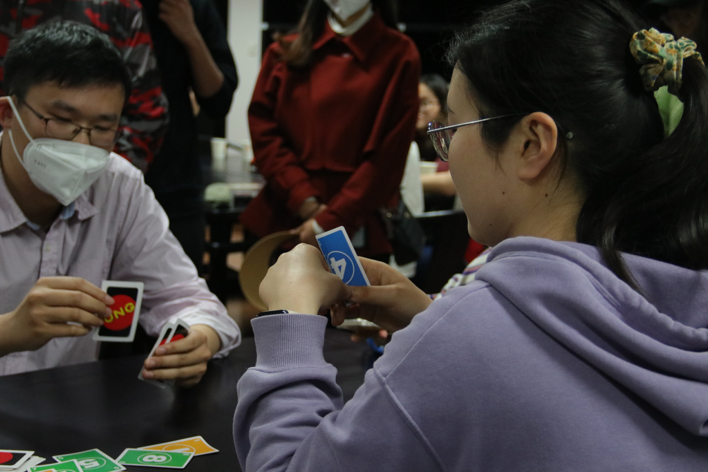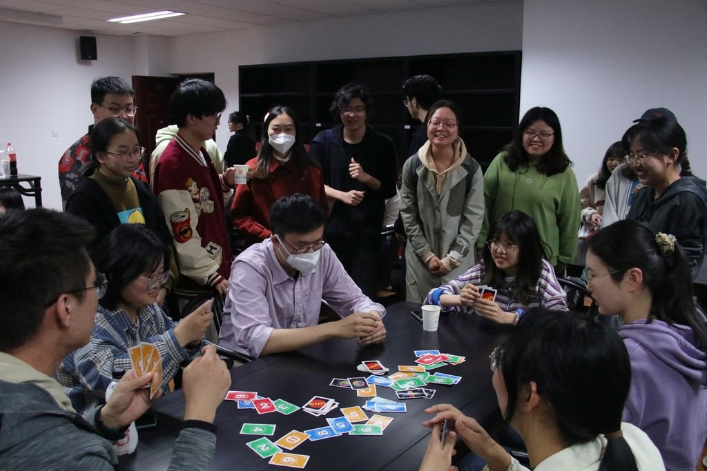 晚上的UNO桌游活动依旧激动人心,六组选手同时比拼,初赛三轮中的每一组第一晋级决赛。“UNO”的呼喊混合着“浅摸X张”的嬉笑,活动室里一派欢乐的气氛。相互“坑害”之下,原本陌生的同学迅速熟络,友谊在你来我往的“加牌”间不断升温。在欢声笑语中,一天的联谊活动也悄然落下帷幕。
