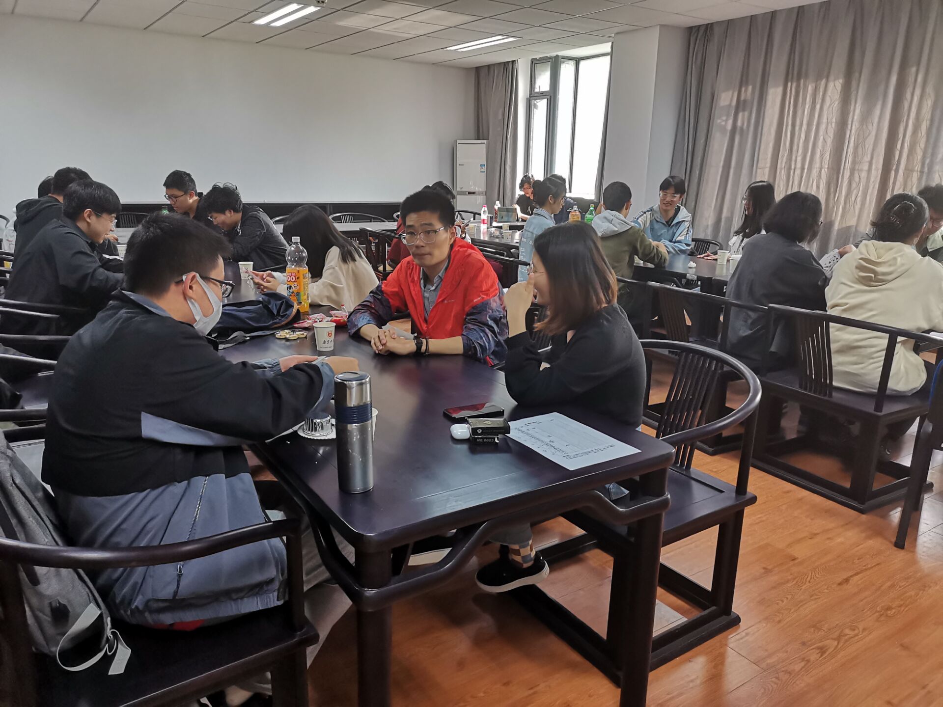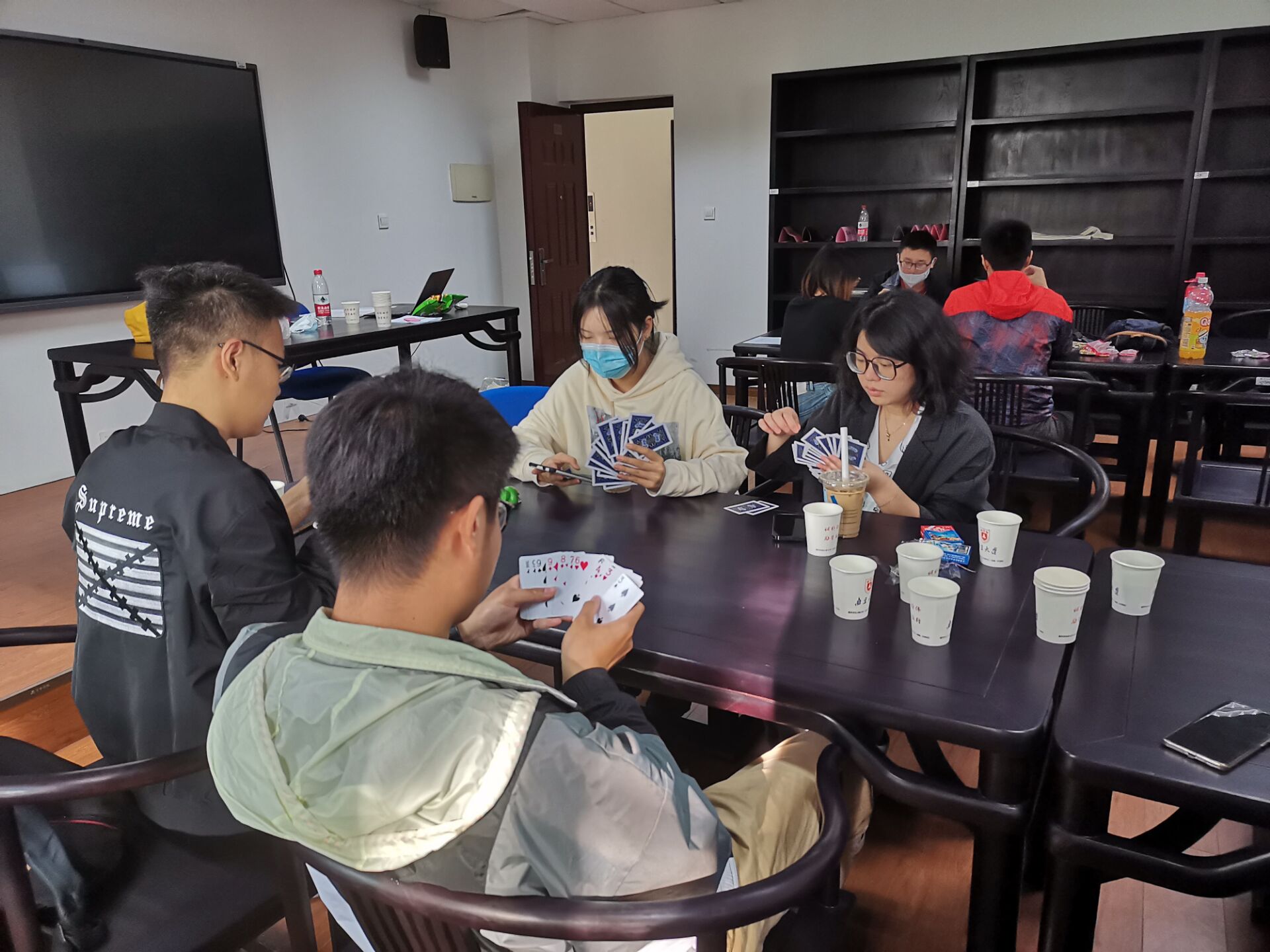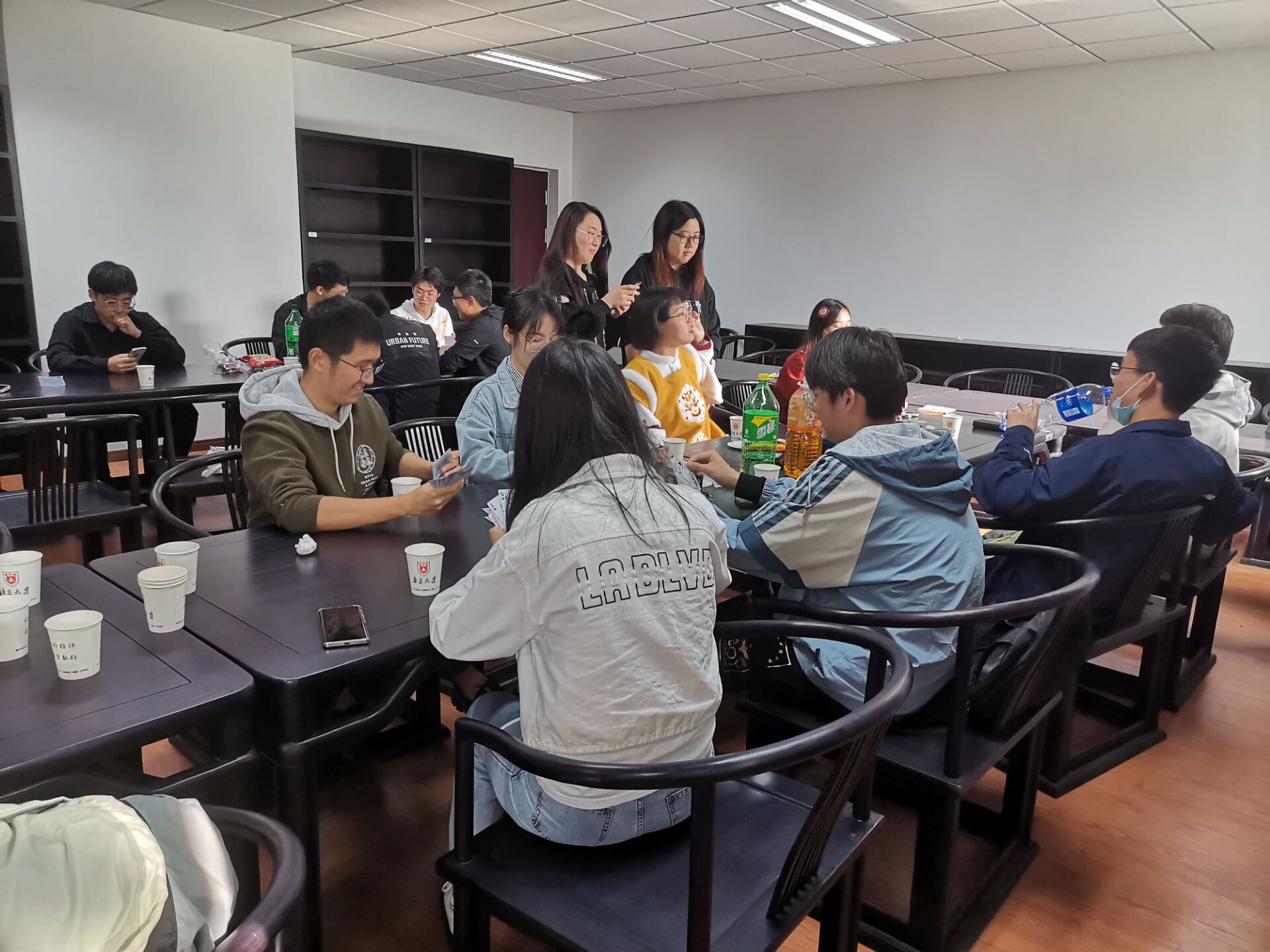 晚上的UNO桌游活动依旧激动人心,六组选手同时比拼,初赛三轮中的每一组第一晋级决赛。“UNO”的呼喊混合着“浅摸X张”的嬉笑,活动室里一派欢乐的气氛。相互“坑害”之下,原本陌生的同学迅速熟络,友谊在你来我往的“加牌”间不断升温。在欢声笑语中,一天的联谊活动也悄然落下帷幕。