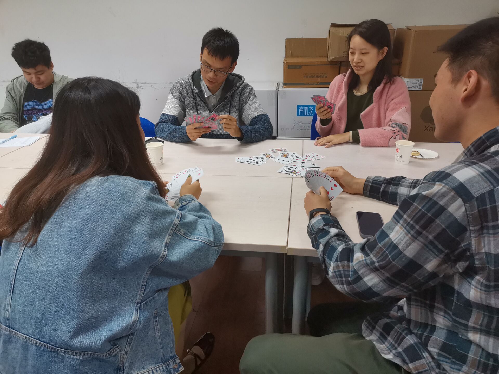 与王者荣耀争霸赛连场进行的是掼蛋比赛。在享用丰盛的茶歇后,选手们依序落座,根据抽签匹配对手。掼蛋比赛以个人积分形式排名,不论是老手新手,都很快投入到激烈的战局中。学习之余难得闲暇,大家在棋牌博弈之中,享受这美好的夏日午后。