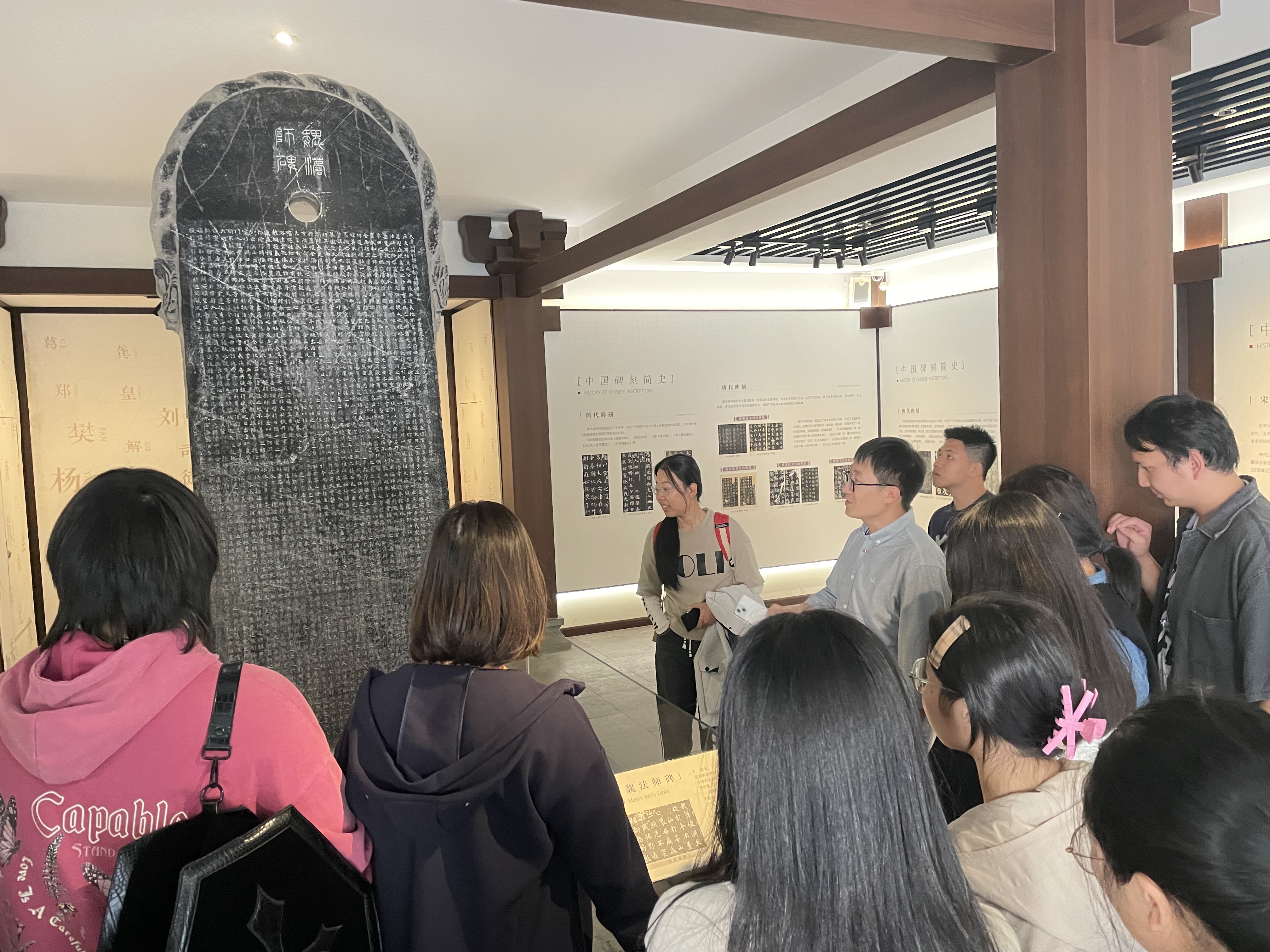 随后在于老师和薛老师的带领下,同学们沿着馆内展览路线对出土文物一一参观。我们重点参观了隋炀帝墓志。恰巧昨日参观焦山碑林时,有同学对墓志和墓志铭的基本概念提出了疑问,此时正好得到了现场解答。《隋炀帝墓志》右上部分因与志盖紧密贴合,石面保存较好,文字清晰,但其余部分剥蚀严重,石筋纵横,对志文的解读有较大影响。于老师和同学们就墓志拓本上第七行贞观纪年的“▢年”文字展开了讨论,重点分析了“元年”和“九年”两种解读各自的可行性。