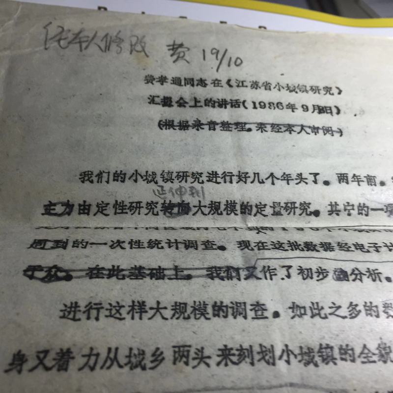 费孝通作报告,我负责记录,整理好后送他审阅,这是他在我记录的稿子上作的修改,改好后写上他的意见,“经本人修改”,并签字“费”,写上日期。老先生喜欢用中华牌粗芯铅笔写字。
