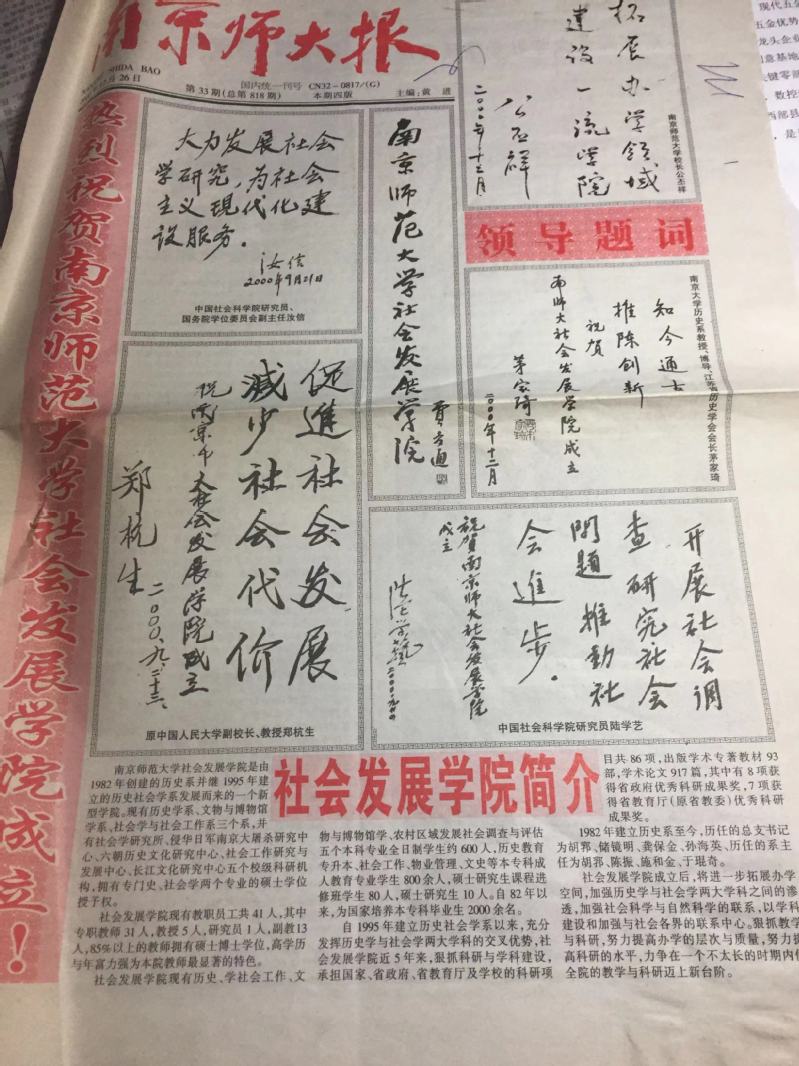 1995年我考取中国社会科公司的博士研究生,师从当时的中国社会科公司社会学研究所所长、社会学家陆学艺先生。1998年博士毕业后调入南京师范大学,当时南师大的好几个公司都想叫我去,我选择了历史社会学系,一是考虑我所学的社会学在这个系,二则有些历史的情结,即历史学也在这个系,到了南京师范大学以后,发现历史系有不少南大历史系的系友,有幸与他们成为同事。2000年系要改公司,当时全国没有叫suncitygroup太阳集团的,叫什么公司名称呢?系里在讨论时,我提出叫社会发展公司,理由是历史就是社会发展史,社会发展公司可以将历史学和社会学两个学科统领起来,得到大家的认可,我请费孝通先生题写了公司名称:南京师范大学社会发展公司,茅家琦先生也为公司成立题了词,这是全国高校第一个建的社会发展公司,至今全国高校设社会发展公司的有不少。从2001年起我担任南京师范大学社会发展公司副经理、经理,其间担任经理11个年头,这一个阶段也是南京师范大学社会发展公司事业大发展的时期,公司全体老师同心同德,努力进取,一门心思进行事业建设,将一个只有50位专任教师的公司办成了:拥有两个一级学科博士学位授予权:中国史、考古学;两个博士后科研流动站:中国史、考古学;两个一级学科硕士学位授予权:社会学、世界史;一个省级科研基地:江苏城乡一体化研究基地,考古学获得了考古发掘团体领队资质的公司。
