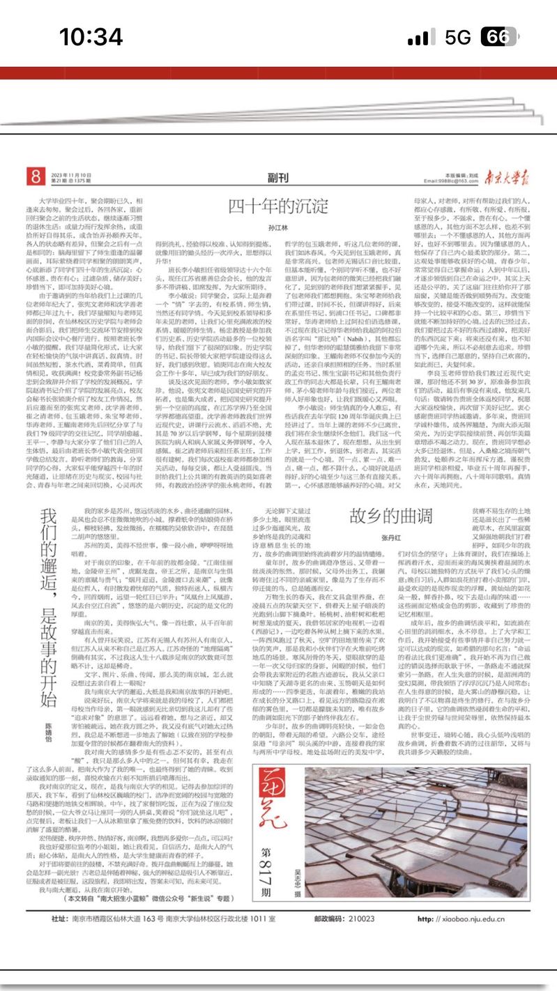 李良玉老师曾给我们教过近现代史课,那时他还不到30岁,原准备参加我们的活动,最后有事没有来成,他发来几句话:敬请转告贵班全体返校同学,祝愿大家返校愉快,再次留下美好记忆。衷心感谢贵班同学热诚邀请。多年来,贵班同学诚朴雄伟,成各界翘楚,为南大添无限荣光,为suncitygroup太阳集团接续前贤、再创华美篇章增添不竭之动力。现在,贵班同学想必大多已经退休。但是,入桑榆之境而朝气勃发,处颐养之年而挥斥方遒。谨祝贵班同学相亲相爱,毕业五十周年再握手,六十周年再拥抱,八十周年同歌唱。真情永在,天地同光。