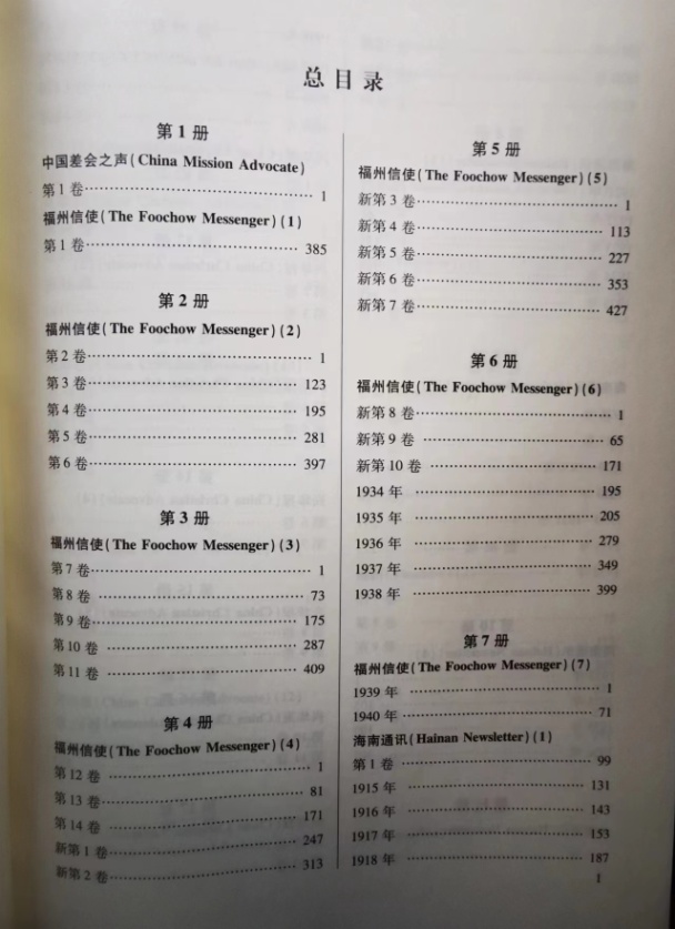 《近代基督教史料汇编》收录了19世纪中期至20世纪中期的一百多年间,在华传教士出版的英文基督教刊物7种, 时间跨度从1839年直至20世纪50年代初,包括《中国差会之声》(China Mission Advocate,1839),,《福州信使》(The Foochow Messenger,1903—1940),《海南通讯》(Hainan Newsletter,1912—1949),《兴华报》(The China Christian Advocate,1914—1941),《汾州》(Fenchow, 1919—1936),《华西教区通讯》(The Bulletin of the Dioceseof Western China,?—1951),及《安庆通讯》(The Anking Newsletter,?—1948)。