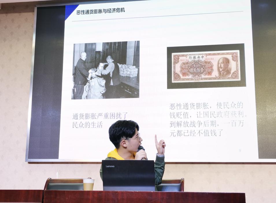 本次宣讲由抗日胜利后的南京、渡江战役与解放南京、民国旧都的重塑与新生以及团学工作与员工的革命实践四部分组成。前两部分的核心为“解放”,汤芮同学介绍了渡江战役的总体境况和过程,并在现场与浦口区实验公司的同学们展开互动。他的讲述以大时间线和具体事件穿插进行,不仅厘清了南京解放的经过,也以更生动具体的方式呈现了人民群众在解放前的困窘生活以及为了解放而进行的艰苦斗争。
